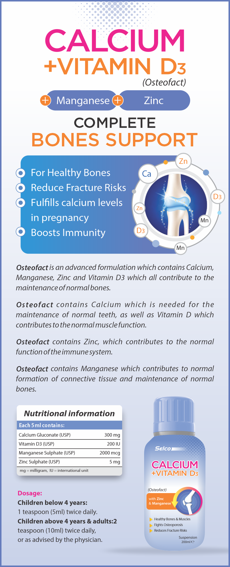 Selco Calcium + Vitamin D3 suspension contains Calcium which is needed for the maintenance of normal teeth, as well as Vitamin D which contributes to the normal muscle function.