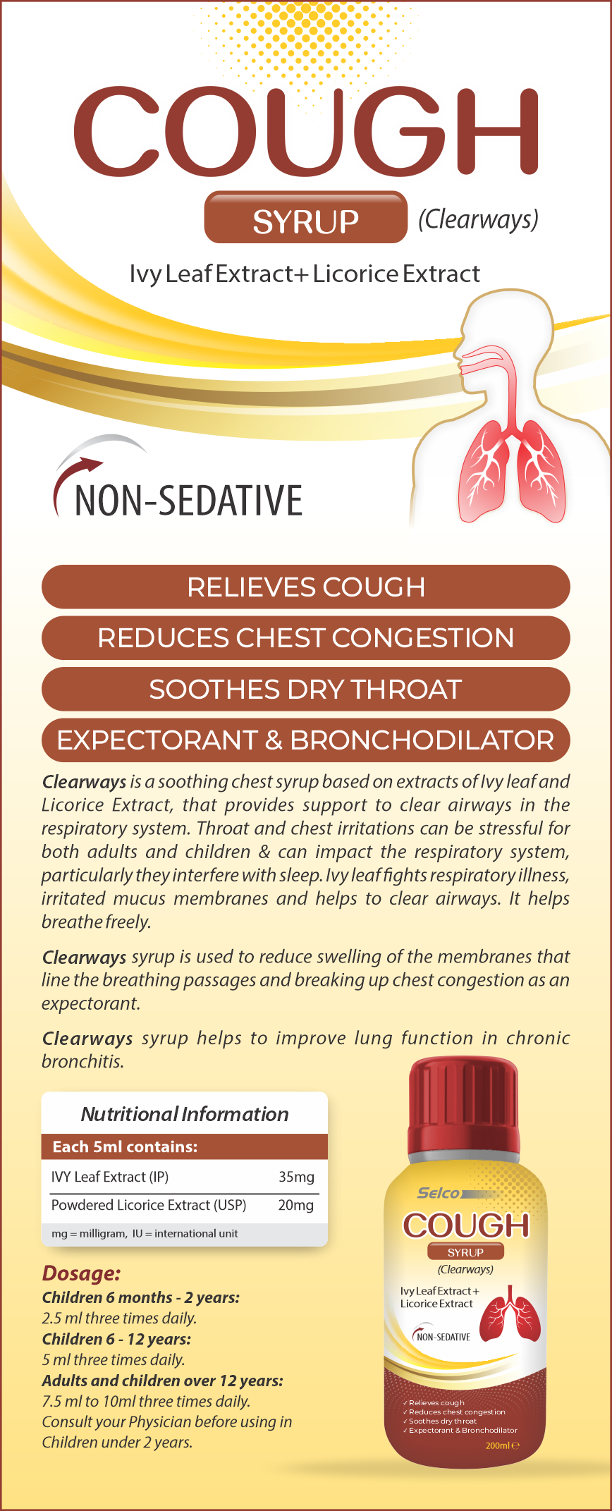 Selco Cough Syrup is a soothing chest syrup based on extracts of Ivy leaf and Licorice Extract, that provides support to clear airways in the respiratory system. Throat and chest irritations can be stressful for both adults and children & can impact the respiratory system, particularly they interfere with sleep. Ivy leaf fights respiratory illness, irritated mucus membranes and helps to clear airways. It helps breathe freely.